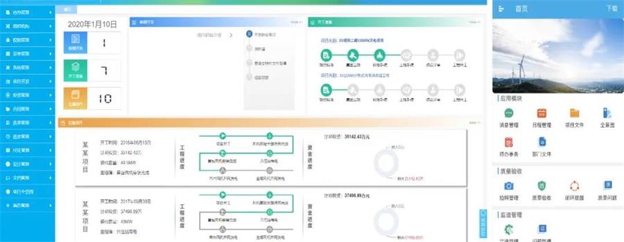 项目各环节精细化管理+项目全景图速览。基建项目管理工作千头万绪,工期紧、任务重,各类大事小事常常让我们焦头烂额。而现在通过“风电基建工程管控系统”,能够生成项目全景分析展示图,一键速览项目整体进度、资金使用、流程节点、合同执行等情况,还能够实现自动生成工作月报、图表展示各部分进度、回溯归类各流程节点文件资料、形成概算动态管控台账、进行风险管控和隐患排查等精细化管理功能,而且还帮助我们顺利理清了风电场建设项目中的各类工作,实现提质、降本、增效的目的。
