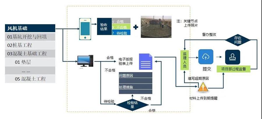 质量验评全过程动态管控。通过“风电基建工程管控系统”的移动端APP,我们监理人员就可以根据质量验评划分表实时录入项目质量验收时间和结果、验评资料、关键节点图片等信息,就像发朋友圈一样简单。同时,系统还支持监理监造验评结果对比分析、质量验收超期预警等功能,更好地实现了项目质量双线管控。