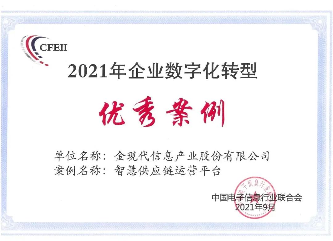 金现代公司“智慧供应链运营平台”入选中国电子信息行业联合会2021年企业数字化转型优秀案例