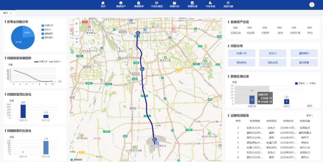平台基础数据管理中心包括数据资产目录、检索、维护、数据质量标准等功能模块。可通过动态检测车、轨检小车、桥梁监测、沉降监测、无缝位移观测桩等多种设备设施状态感知手段,将地理信息数据、基础设施台帐数据、维修病害数据及各类型巡检监测获取的设备状态数据汇集到智能平台当中,实现对于轨道、土建、供电等多专业运行状态的智能感知,解决人工检测和收集数据效率低、准确率差的问题,准确反映基础设施运行状态。