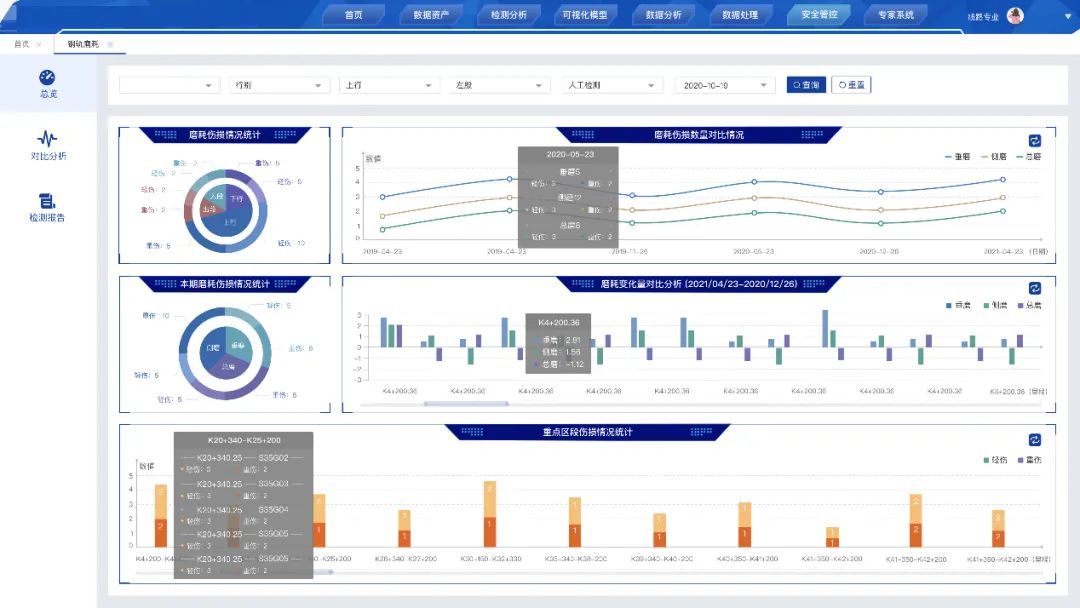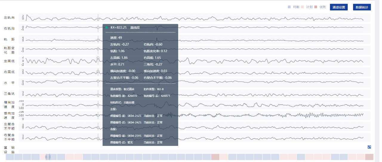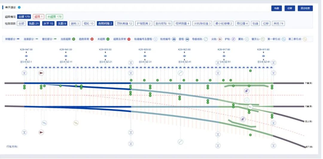 平台的检测分析管理中心将以上检测数据,与钢轨、焊缝、轨枕等基础设施台账及曲线、结构型式等线路要素相关联,利用统计方法、时间序列、数据挖掘等多种算法模型对数据进行综合分析应用,生成钢轨和道岔等比例可视化示意图、动静态几何检测波形图、超限评判图、对比分析图、趋势分析图、设施综合评价图等巡检数据报告。