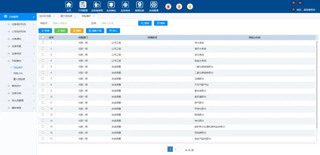 通过应急指挥管理系统,可根据国家和行业相关规定,实现对于应急组织机构、应急预案、应急物资、风险点管控、应急法规、危化品管理、事故统计、应急值排班等日常工作的智能管理,通过该系统还可制定应急演练计划和方案,借助事故情景记录演练全过程,并对演练效果进行评估,解决企业应急管理落实不到位的问题。