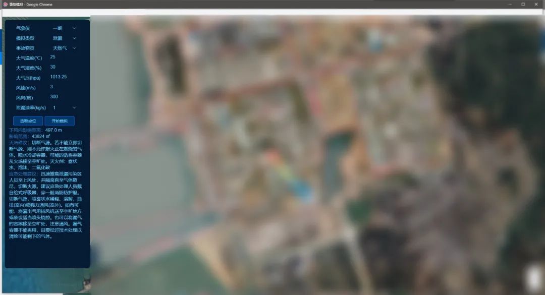 通过GIS地图,可图形化展示厂区摄像头、关键设备、气体检测仪、物资存放点等10余类基础信息,形成监控一张图,准确反映事故现场情况。同时,依托GIS地图,可通过空间数据库技术实现风向标、水炮、环境监测点、应急疏散路线、救援路线等协同标绘,并通过危化品泄漏扩散、爆炸危险性、火灾蔓延3类分析模型对事故进行模拟,在GIS地图中直观标注事故影响范围、给予应急处理建议,以辅助应急决策。