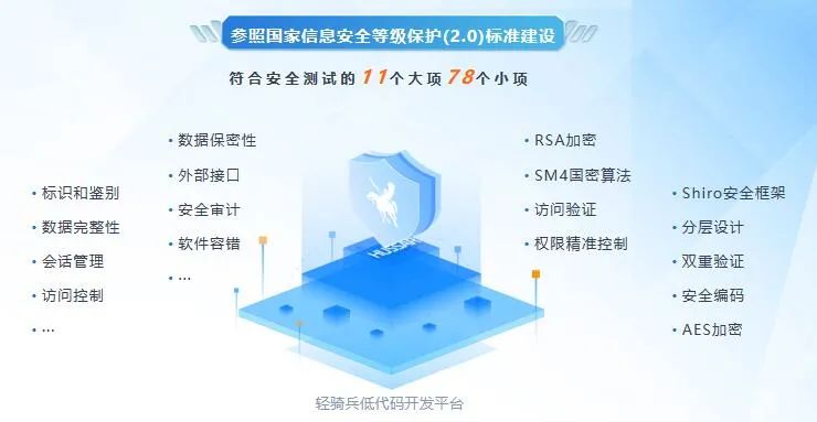 公司自主可控的国产化产品“轻骑兵低代码开发平台”,严格参照国家信息安全等级保护(2.0)标准建设,以数据仓库分层设计、客户端与服务端双重验证、权限精准控制等方式,保障数据传输、存储等过程的保密性、完整性和安全性。当前,平台已通过电力、轨道交通、航天、石油石化、政府等行业的等保测试,并符合涉密信息系统分级保护要求。