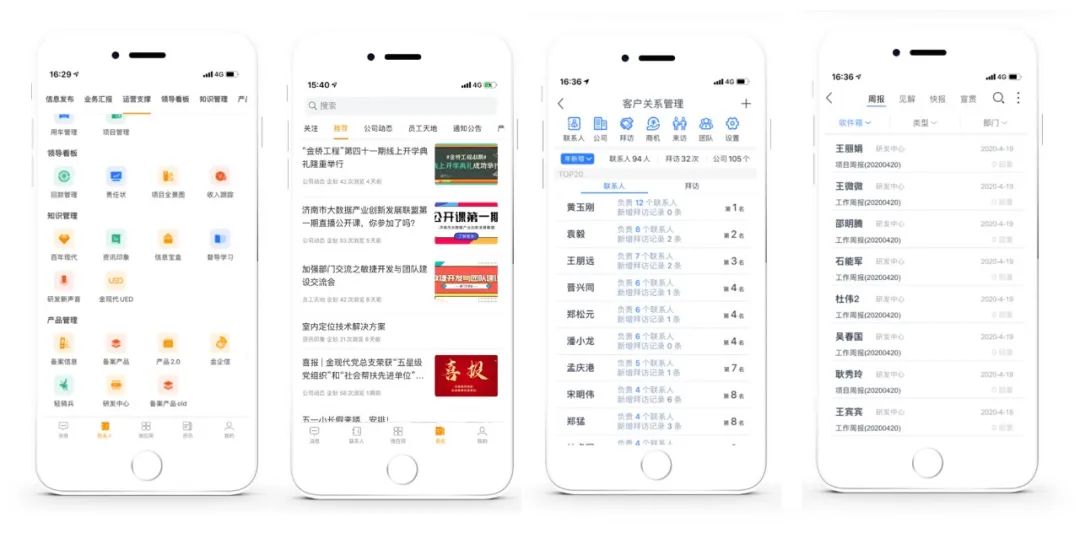 “金企信”能够帮助政企单位构建可集成的、可扩展的移动门户,将开元(中国)资讯、通知公告、全员通讯录、工作圈等功能,以及文档管理、客户管理、任务督办、月报周报、流程审批、管理驾驶舱等办公微应用整合到一起,统一入口,大幅降低政企单位移动化与开发成本,快速构建政企移动办公生态。