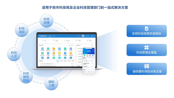 为地方政府科技局及大型企业科技管理部门提供科技管理一站式解决方案,解决科技管理(单位)项目管理过程不透明,科技政策传递不通畅,科技资源利用率低,领导决策缺少数据支撑的问题。通过对科技项目、科技资源等科技创新管理对象全覆盖管理,实现项目的管理跟踪、决策的支撑辅助、信息的交汇共享,从而提升科技管理的效率、提高科技服务的质量,为科技创新提供有力支撑。