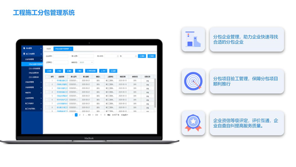施工分包管理系统是一款面向工程行业对施工分包企业的信息、人员、合同、企业资信等级评定实现一体化管控的系统。通过对分包合同进行规范化管理,解决分包商结算和分包合同脱节的问题,根据分包合同工程量清单进行计价对比,确保分包商结算有序、受控,避免进度款支付节点不明确,造成经济风险。本系统可以提高项目施工的综合配套管理能力,加强对施工分包企业队伍、人员的管控,以及对施工分包合同、变更、支付的管理能力。