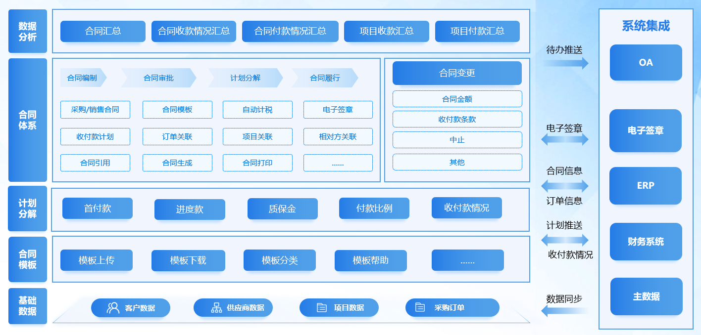 全流程管控,高效协同:覆盖合同起草、审批、签署、执行、归档、计划分解、变更等全生命周期,使用可视化流程引擎,确保流程合规且高效。
