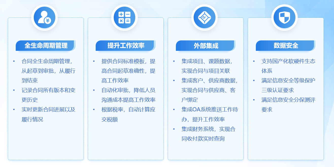 合同管理系统是面向政企单位的智能合同管理平台,支持在内网独立部署,实现合同从创建、审批到执行的全流程自主可控。基于主租户模式架构,系统可满足集团化企业多子公司协同管理需求,已成功应用于军工、航天等领域。
