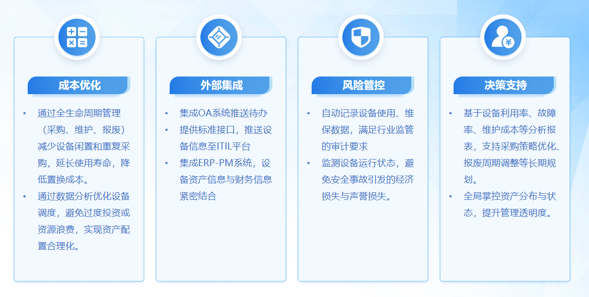 智能管理,高效运维:支持资产全生命周期管理,覆盖采购、入库、使用、维修、报废全流程,降低人工维护成本;