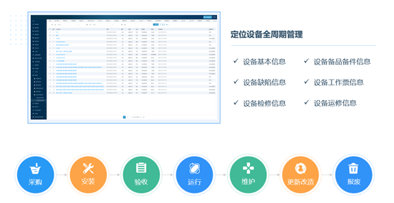 设备全生命周期管理:从设备采购、设备安装调试、设备使用、设备报废全过程进行跟踪,并对设备使用期间的维修、拆除、验收、移动等所有操作进行记录,实现设备全生命周期管理。
