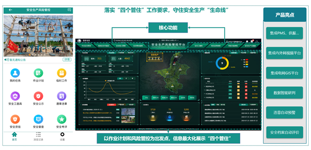 安全生产风险管控平台是严格按照“四个管住”(管住计划、管住队伍、管住人员、管住现场)工作要求,建设涵盖作业安全智能化管控、企业人员安全准入、现场安全监督可视化、安全管控中心值班管理、安全工器具管理、综合应急指挥管理、风险全景感知、安全生产大数据等业务场景的一体化系统。通过数据中台实现PMS、TMS、供服指挥、配网工程、基建数字化管控等专业业务系统数据的实时同步共享,减轻各专业一线员工数据重复录入的工作;基于“i国网”移动APP实现作业现场作业准备、作业实施、到岗到位、安全督查、违章记分等功能,提高各级管理人员“四不两直”安全督查效率,提升公司安全生产风险管控水平。