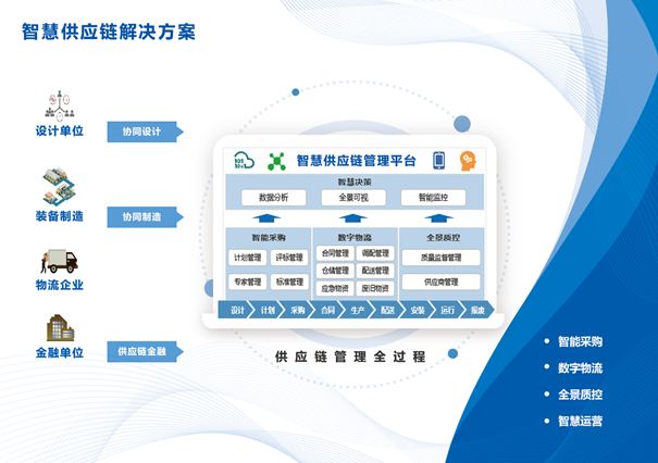 智慧供应链管理平台,依托“云大物移智”新一代信息技术,打造智能采购、数字物流、全景质控三大业务链,为企业构建内外高效协同的智慧供应链体系。平台能够全面提升企业运营分析决策、资源优化配置、风险监控预警、数据资产应用、应急调度指挥等能力,使计划匹配更精准、履约协同更高效、物资交付更快捷,为企业提供高质量、高效率的供应链管理支撑。