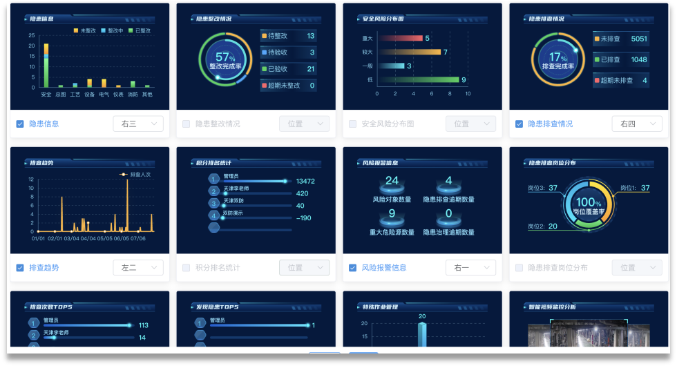 安全生产一张图可以数据可视化形式实现全厂的报警数据、特殊作业、应急资源、重大危险源、智能视频分析等信息集中展示,并能够进行穿透跳转,全厂安全态势一目了然。同时,系统内置了十余种维度的统计分析,支持用户自定义配置一张图上的统计图表。