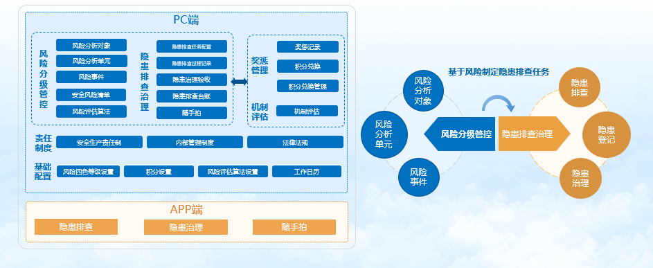 双重预防机制管理以国家相关政策为依据,帮助企业构建风险分级管控与隐患排查治理双重预防机制,明确风险严重程度,把责任分解到各层级岗位,将风险控制在隐患形成之前、将隐患消除在事故发生之前,防范安全事故的发生。