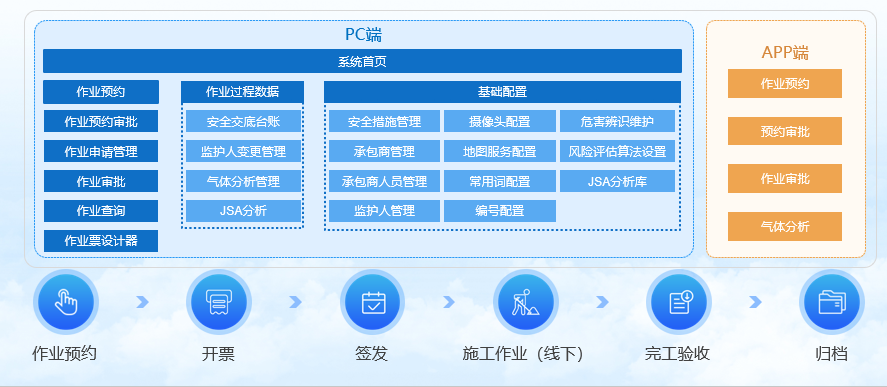 特殊作业全过程管控以《危险化学品企业特殊作业安全规范》(GB 30871-2022)为建设依据,实现动火作业、受限空间作业、盲板抽堵作业、高处作业、吊装作业、临时用电作业、动土作业、断路作业8大作业许可证的线上快速高效办理,帮助企业更好的规范施工作业安全管控工作,降低或规避作业过程中潜在的风险,更好的保障作业人员安全。