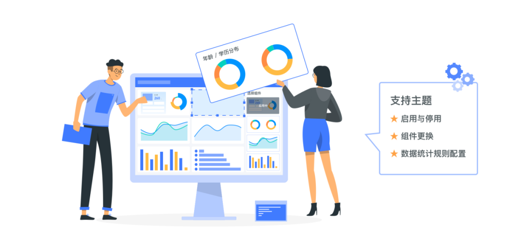 系统内置大量的分析主题,支持主题的启动与停用、组件更换、数据统计规则配置。