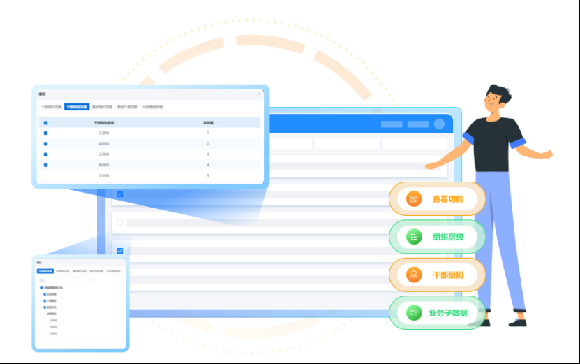 系统提供界面定制选项和细致的权限管理功能,客户可以自主配置用户的查看权限,如能查看的功能、组织层级、干部级别、业务子数据等。