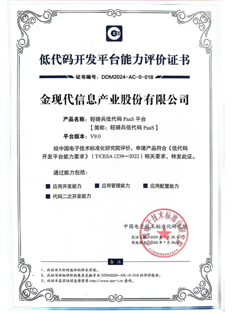 近日,中国电子技术标准化研究院公布《低代码开发平台能力要求》最新评估结果,金现代轻骑兵低代码开发平台通过测评。