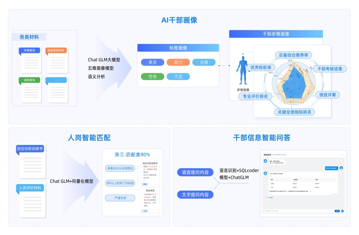 在央国企干部管理的实践中,一些企业已经通过智能化管理系统取得了显著的成效。以金现代智慧识才干部大数据分析系统为例,该系统能够整合汇聚干部的基础信息、考核数据、谈话考察材料等多类数据,构建干部精准画像分析模型,为干部“画像”,清晰呈现干部的素质基础、胜任能力等多维动态;在人岗匹配方面,系统能自动分析岗位任职说明书、人员评价材料,提炼岗位标签和人员标签,并进行匹配分析,实现人岗智能匹配,提高干部选拔的准确性和效率;在干部数据统计方面,系统实现“智能问数”,支持通过自然语言问答的方式快速获悉各类干部数据,为企业的科学决策提供有力支持。
