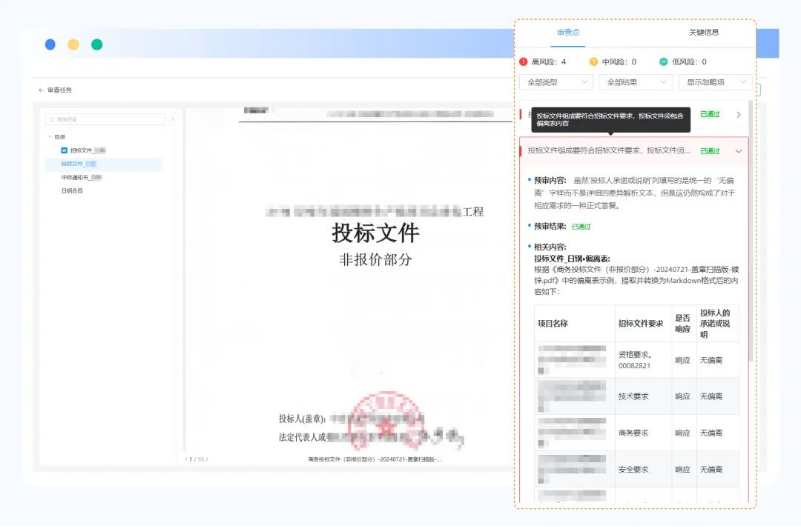 不仅如此,系统还能自动识别投标文件中的各类资质要求,对资质证明等重要信息进行逐一核查,确保内容完整。