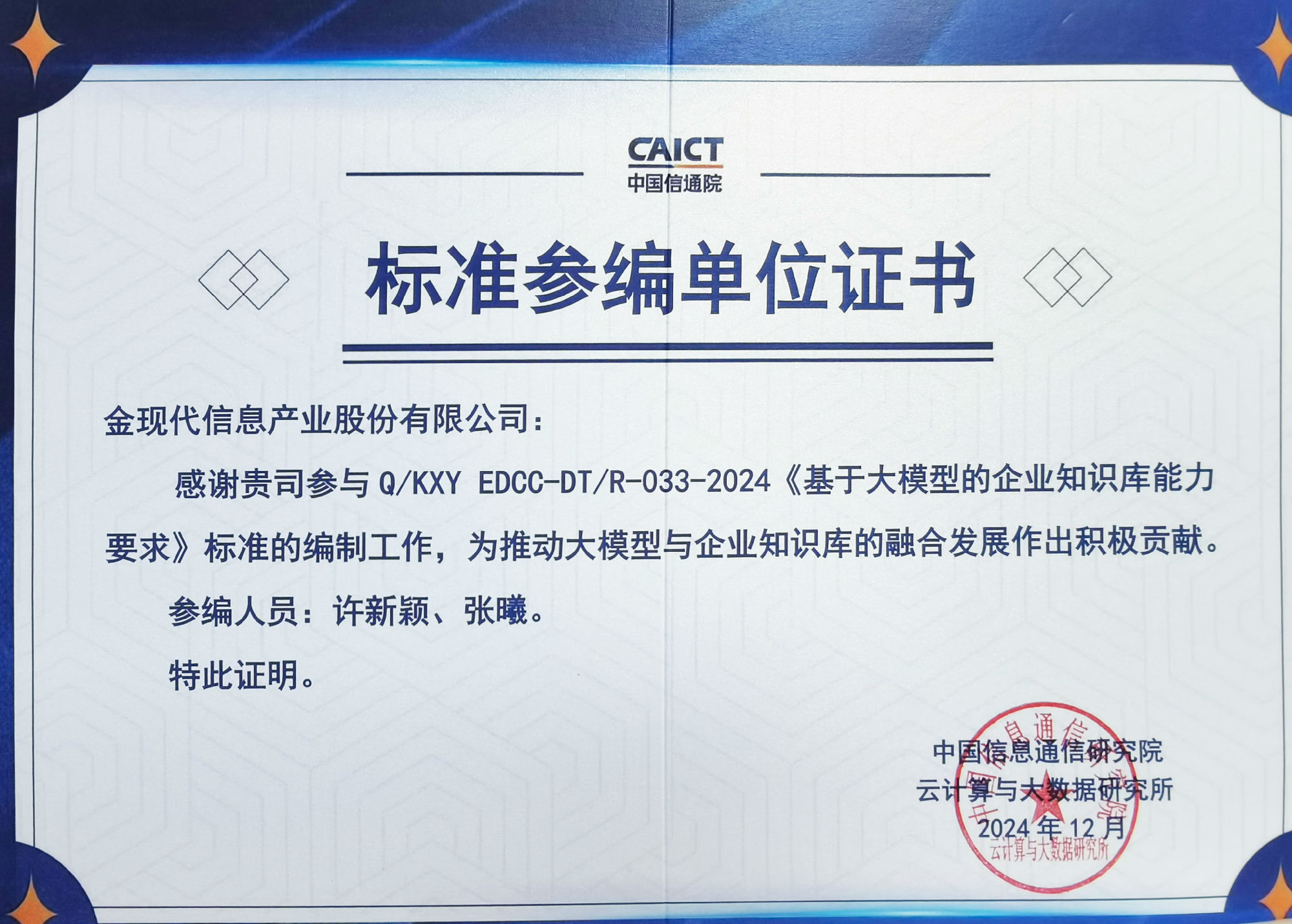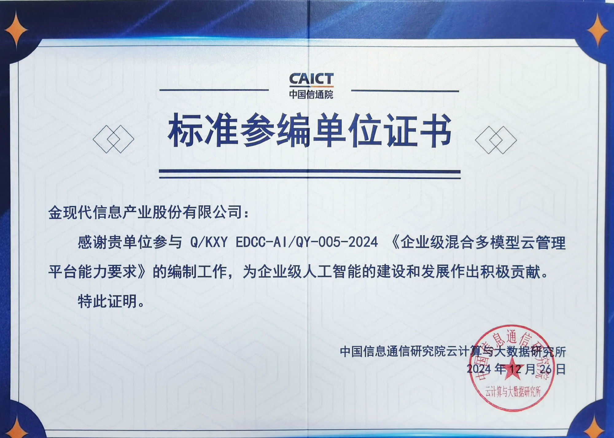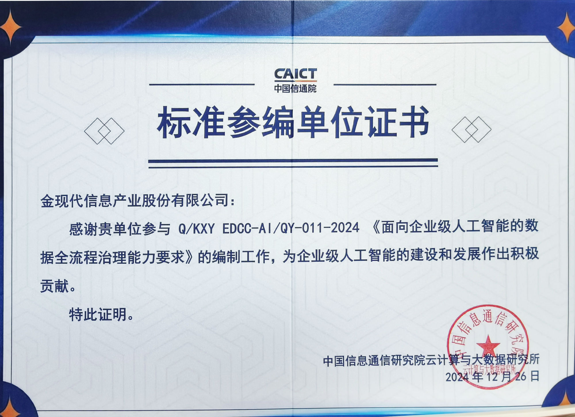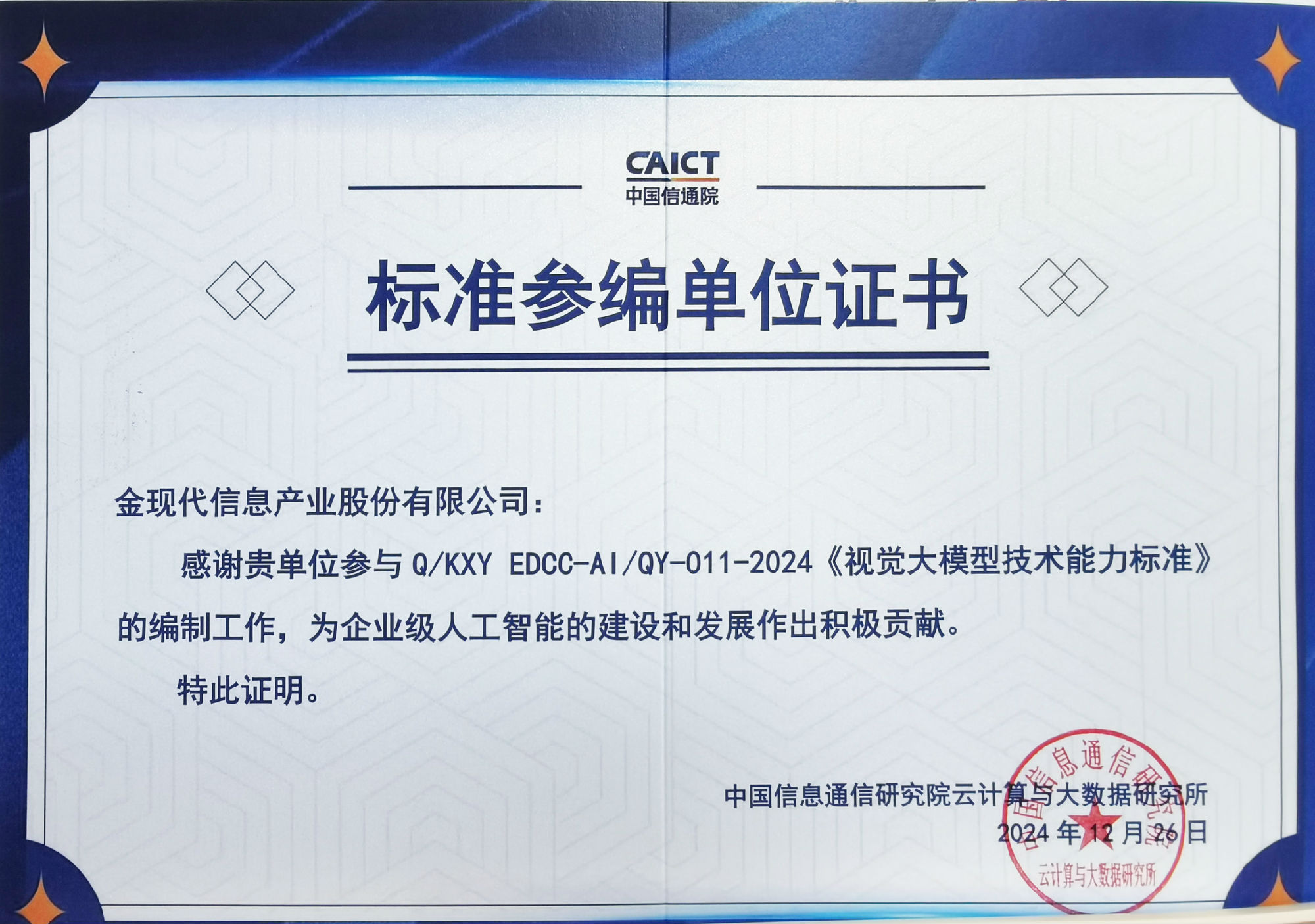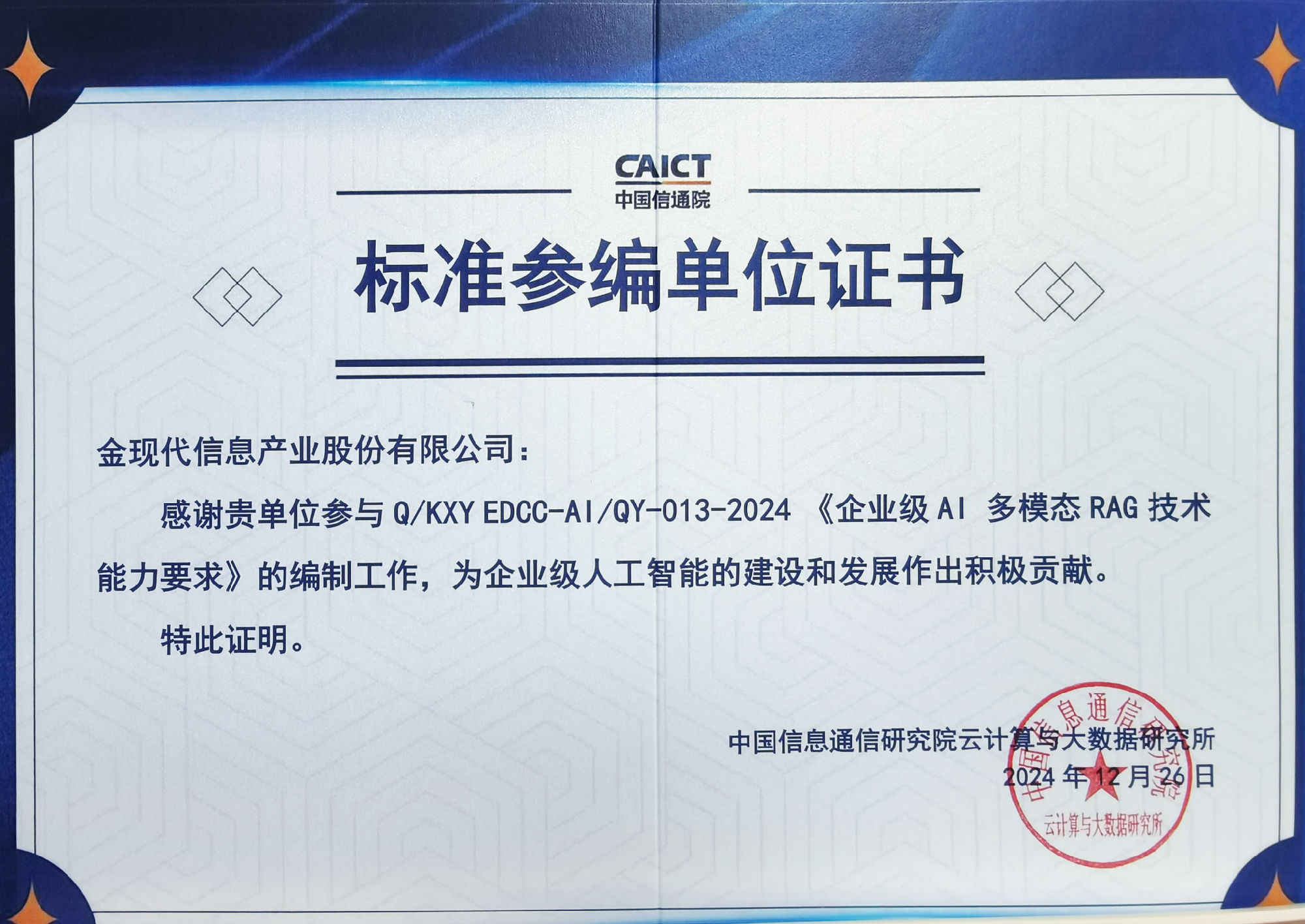 金现代参编中国信通院6项大模型标准,推动企业级AI应用落地