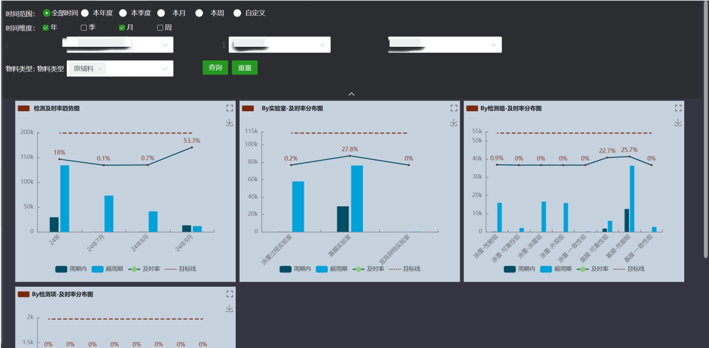 为确保产品质量,中材锂膜建立了从生产到成品的全流程检测体系:不仅要在生产完成后检测成品质量,还要在生产过程中实时监测各项指标。而检测的及时性是保证结果准确的前提。从样品接收到所有检测项目完全提交,金现代LIMS对实验室检测进行全流程管理,根据不同需求进行分类管理,实时追踪检测进度,并直观展示各基地的检测项目及时率数据,方便快速定位延误环节,对不及时的项目进行重点关注和把控。