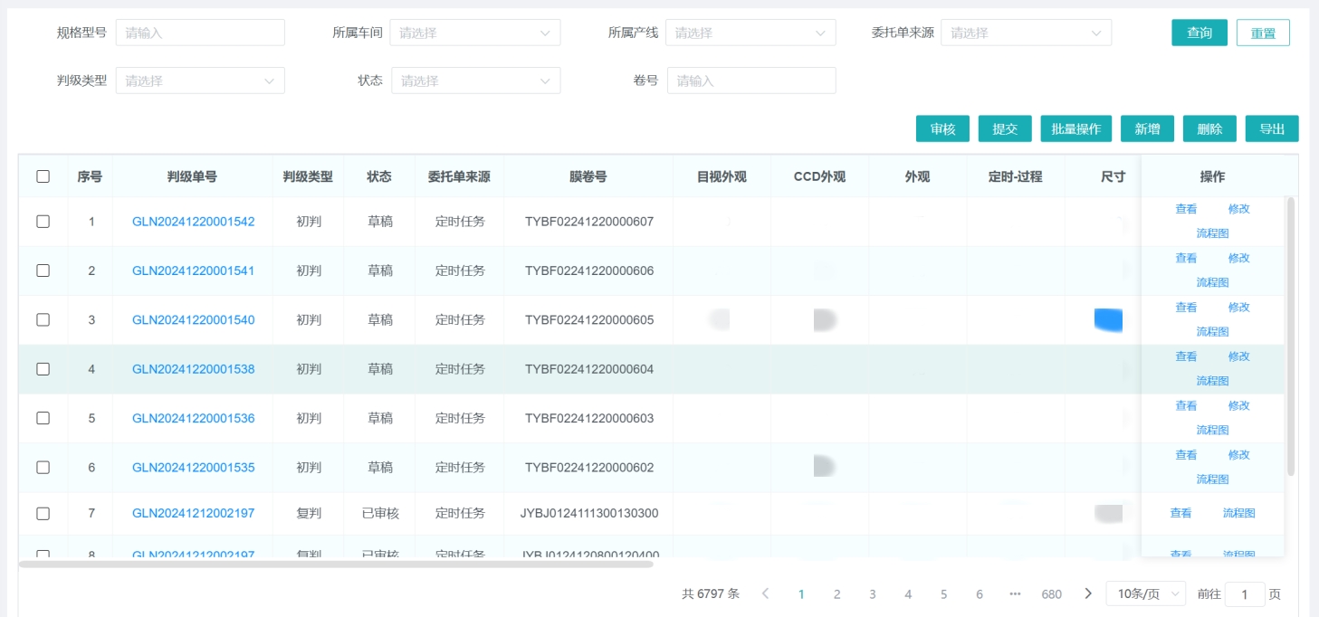 实验室需在膜卷完成检测后汇总结果、判定等级,并基于母卷的结果对子卷判级。原流程依赖人工汇总检测数据并手动判级。金现代LIMS可自动汇总检测结果,按预设规则自动生成判级单。系统还能同步标记不合格项,确保问题一目了然。检测结果和判级信息会实时传递至MES系统,免除了人工梳理和判级的过程,实现了检测流程的自动化管理,提升了工作效率和数据准确性。