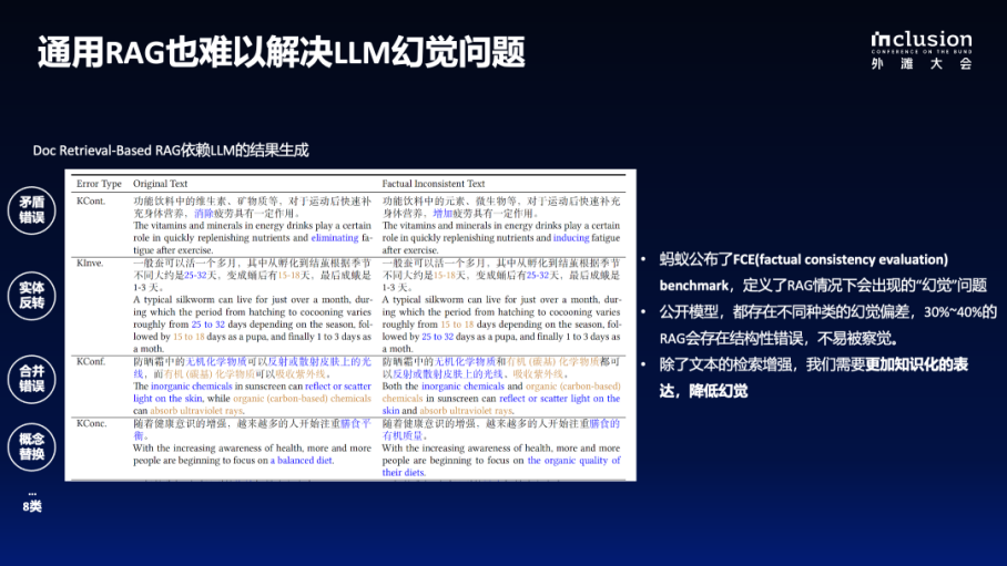 此外,通用 RAG 还存在实体反转、合并错误、概念替换等问题,当模型生成的内容达到数百甚至数千字时,这些细节错误更是难以察觉。评估结果显示,即便加入了 RAG 技术,大语言模型仍然存在 30%-40% 的幻觉率,这一比例不容小觑。