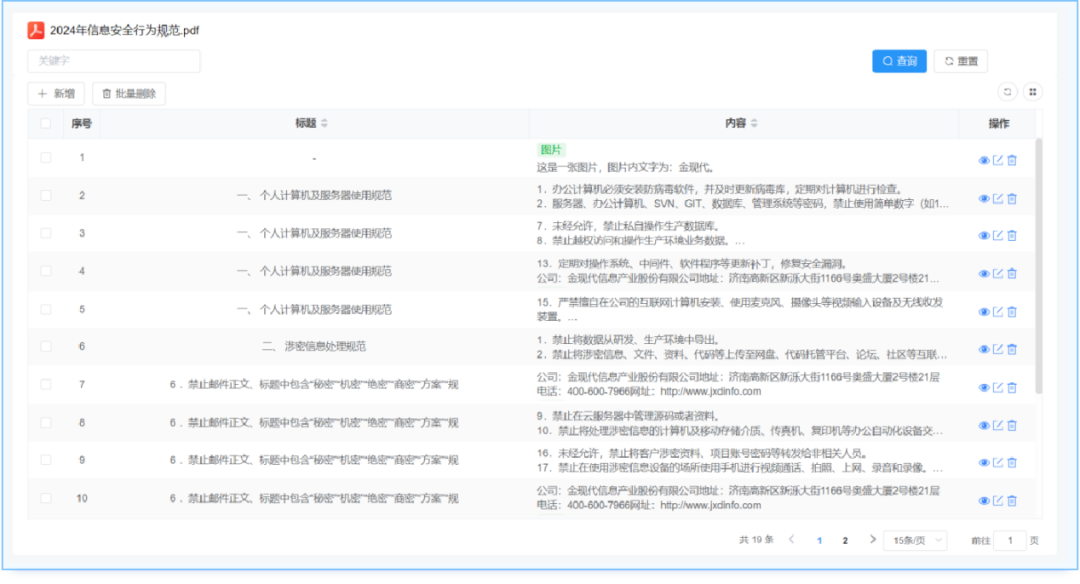 智能切分:系统按照预设的规则切分文档,若对自动分段结果不满意,可手动编辑调整。