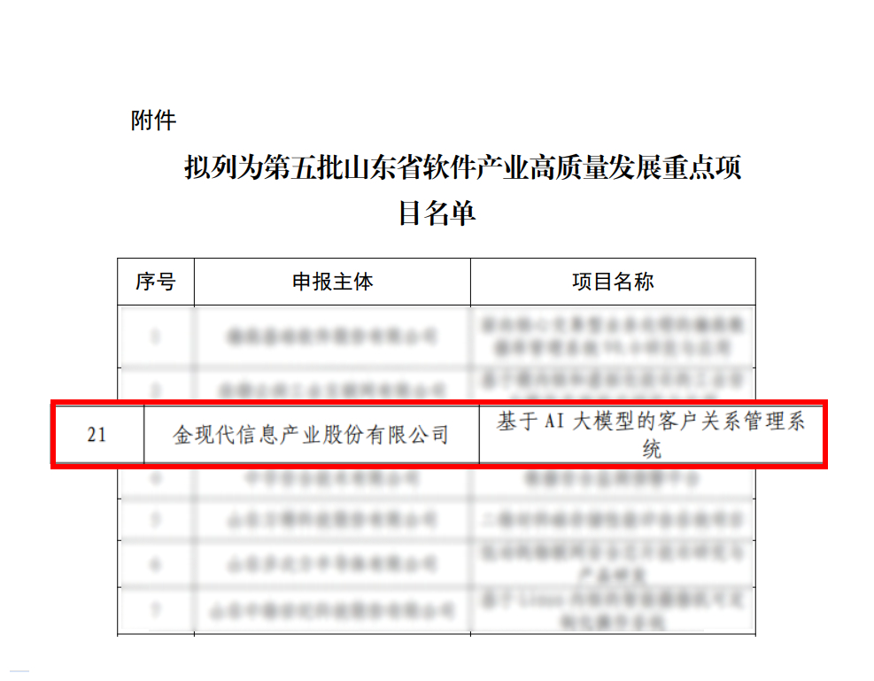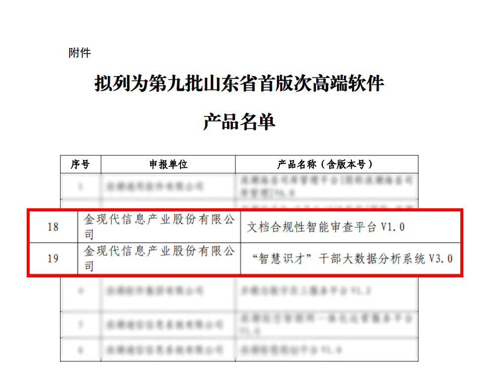 近期,山东省工信厅接连公示第九批“山东省首版次高端软件产品”、第五批“山东省软件产业高质量发展重点项目”名单,金现代文档合规性智能审查平台、智慧识才干部大数据分析系统、基于AI大模型的客户关系管理系统入选,产品技术先进性和市场竞争力备受认可。