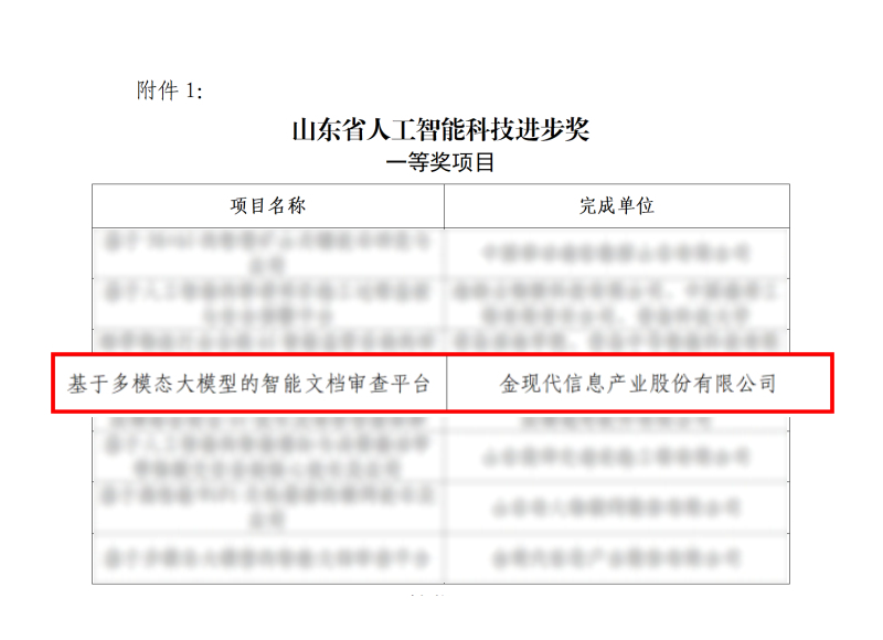 近日,山东省人工智能协会公布“山东省人工智能科技进步奖”获奖名单,金现代“基于多模态大模型的智能文档审查平台”,与中国移动、浪潮等8家单位的AI产品,共同获得一等奖。该奖项由山东省人大常委会教科文卫、国家超级计算济南中心、山东省科学院自动化研究所及知名高校专家共同评审,是山东省级人工智能领域的重量级奖项。