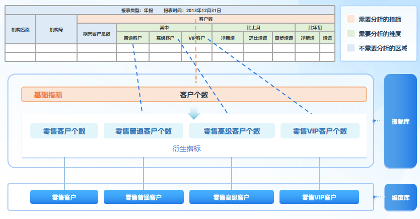 比如在梳理 “客户分析” 相关指标时,不能只停留在 “客户数量” 层面,而是要拆解出 “期末客户总数”“普通客户数”“高级客户数”“VIP 客户数” 等派生指标,同时明确 “净新增客户数”“环比增速”“同比增速” 等组合指标;还要确定分析维度,像时间周期(月度、季度)、客户所属区域等,形成清晰的指标库与维度库。