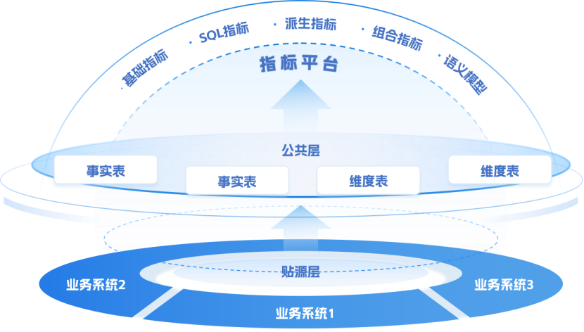 我们做的数据指标平台,正是为了解决这个问题。不管是企业前端的业务系统,还是数据仓库里的贴源层(ODS 层)、公共层(DWD 层、DIM 层),再或者是外部的 API 数据,都能一键接进来,不用重构现有的数据架构。接进来之后,平台会把数据加工成干净、完整的事实表和维度表,为后面算指标打牢基础。